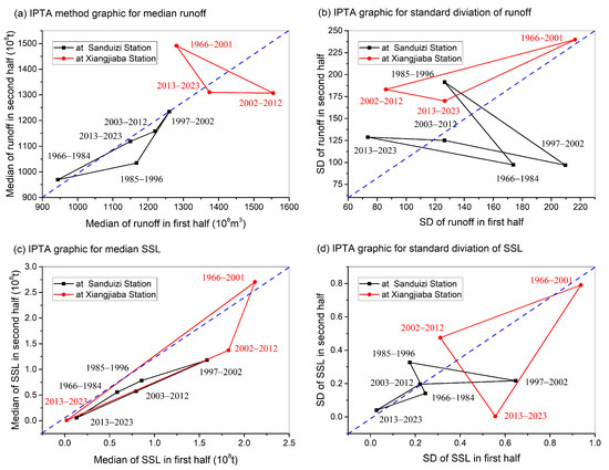 Figure 6. IPTA graph for median and standard deviation of runoff and Suspended Sediment Load (SSL) at the hydrological stations of the study river reach (note: the first and second half are the upper and lower sub-series of the full-sequence matrix composed of variables, respectively).