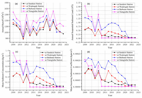 Figure 7. Annual variation characteristics of (a) runoff, (b) suspended sediment load, (c) sediment concentration, and (d) sediment inflow coefficient (the ratio of sediment concentration to flow rate) of the hydrological stations in the study river reach during the period from 2008 to 2023.