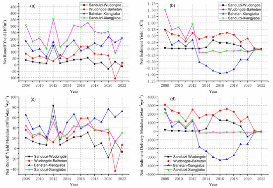 The variation characteristics of annual net runoff yield, net SSL, net runoff yield modulus, and net sediment discharge modulus in the three sub-sections of the study area during 2008–2023 are shown in Figure 6. The annual net runoff yield exhibited significant fluctuations of increase and decrease in 2012 and 2021, respectively (Figure 8a), while fluctuations in other years were weak with no obvious variation trend.