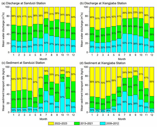 Figure 9. The 100% stacked columns of relative percentage of monthly mean discharge and Suspended Sediment Transport Rate (SSTR) at the entrance (Sanduizi Station located upstream the Wudongde Dam) and exit (Xiangjiaba Station located downstream of the Xiangjiaba Dam) of the river section in the pre-construction period (2008–2012), construction period (2013–2021), and post-completion period (2022–2023) of large-scale cascade dams in the study river reach.
