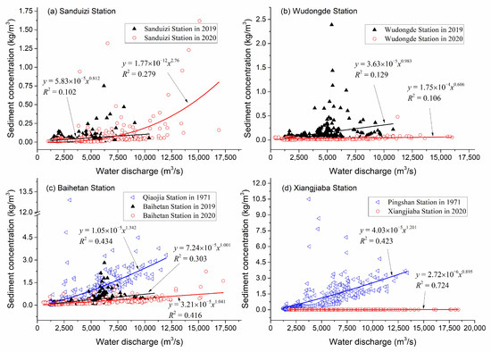 Figure 10. Changes in the relationships between daily discharge and sediment concentration in typical years before and after the construction of the cascade dams in the study river reach (note: Qiaojia Station is located 45 km upstream of Baihetan Station and was abandoned in 2014).