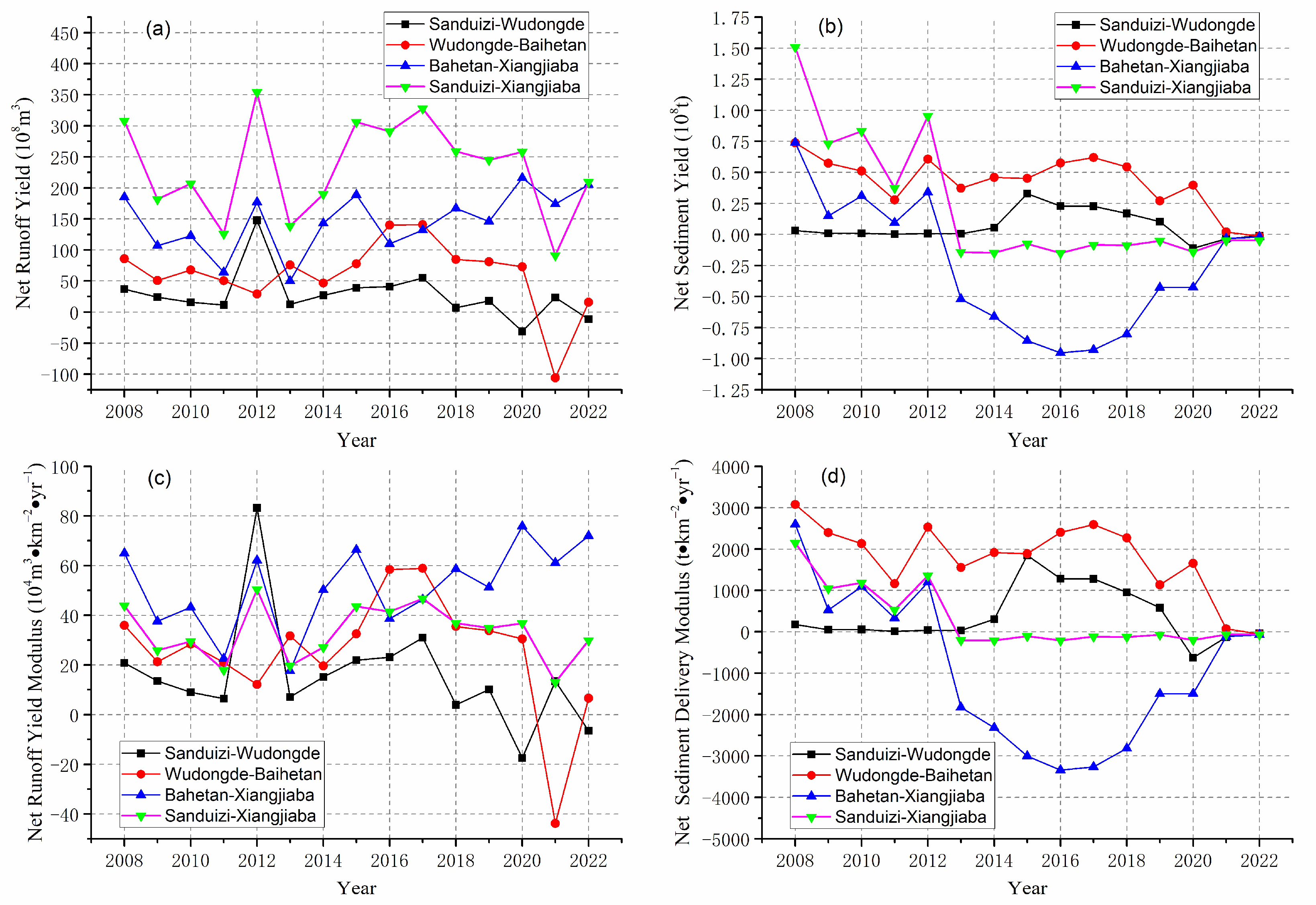 - Liu, H.C.; Zhang, H.L.; Xia, S.Q.; Pang, J.Z. Runoff and sediment discharge variations and corresponding driving mechanism in Jinsha River Basin. Res. Soil. Water Conserv. 2023, 30, 107–115. (In Chinese) [Google Scholar]