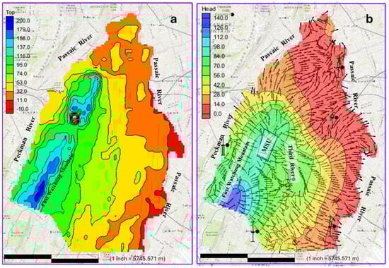 The calibrated groundwater flow simulation model reveals that groundwater heads in the study area vary from approximately 140 m in elevated regions, such as the First Watchung Mountain, to below 5 m near the Passaic River to the east (Figure 2b). The calibrated groundwater flow model shows that a significant portion of the groundwater flow in the study area originates from or passes through the First Watchung Mountain area. This area serves as the primary recharge area for much of the study area. The analysis reveals a distinct flow regime, consisting of both local and regional groundwater systems. In the local flow system, groundwater diverges westward to the Peckman River and eastward to the Third River from the recharge area near the First Watchung Mountain. The regional flow system, originating from the same recharge area, extends further to the distant Passaic River, located at the far eastern end of the study area.