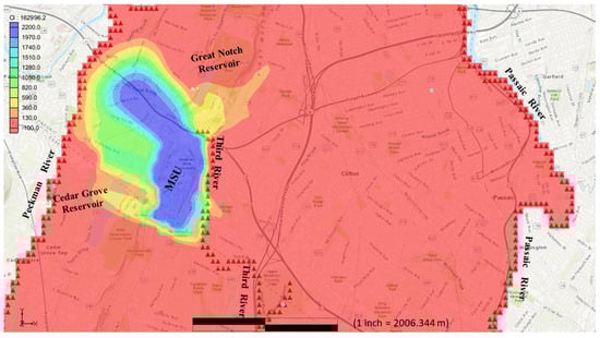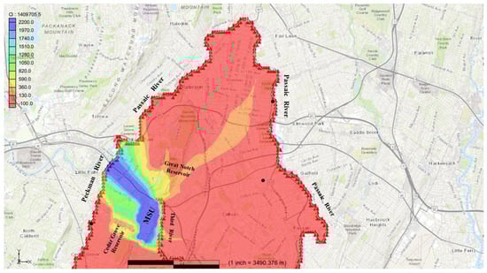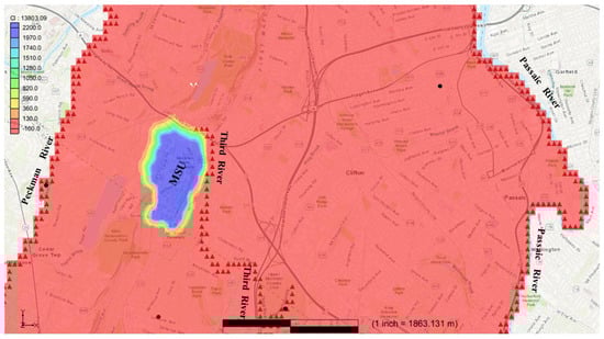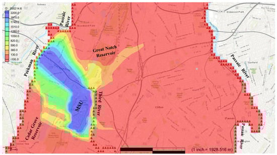 Figure 6 depicts the arrival of chloride at the Great Notch reservoir. According to the model, after approximately 32 years of travel, chloride concentrations in the reservoir increased from an initial level of 0 mg/L to levels surpassing the recommended limit of 250 mg/L. During this period, the chloride contaminants traveled 900 m north along local flow paths to reach the Great Notch reservoir, accumulating significant concentrations over the more than three-decade span. By this stage, the contaminant plume had traveled approximately 1700 m in a northwest direction from MSU. The Great Notch reservoir, owned and managed by the Passaic Valley Water Commission, plays a critical role in meeting the water needs of Passaic County communities. As an open reservoir, its water quality can be influenced by various sources and processes beyond those discussed in this study.