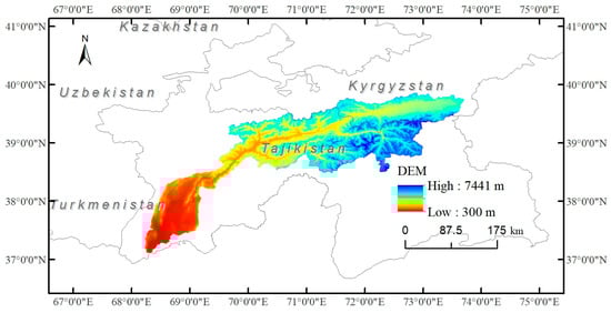 This study takes the Vakhsh River Basin in Tajikistan as the research area. The river originates from the Daumuruk Mountains in southern Kyrgyzstan, flows through Kyrgyzstan and Tajikistan, and merges into the Amu Darya. The Vakhsh River has a total length of 524 km and a drainage area of 39,100 km2, with 7900 km2 located within Kyrgyzstan. The upper reaches are situated in the southeastern part of Kyrgyzstan, bordering China and Tajikistan, spanning 39° N to 40° N and 72° E to 74° E [23] (Figure 1). The source region is characterized by towering mountains and deep valleys, with an average elevation exceeding 3000 m. The climate is predominantly temperate continental, with distinct plateau features. The upper reaches (above 3000 m) have an annual average temperature below 10 °C, while the downstream valley areas approach 18 °C. The southeastern part of the basin (such as the Pamir Plateau) receives an average annual precipitation of about 511 mm, which significantly decreases downstream, with some areas receiving less than 200 mm annually.
