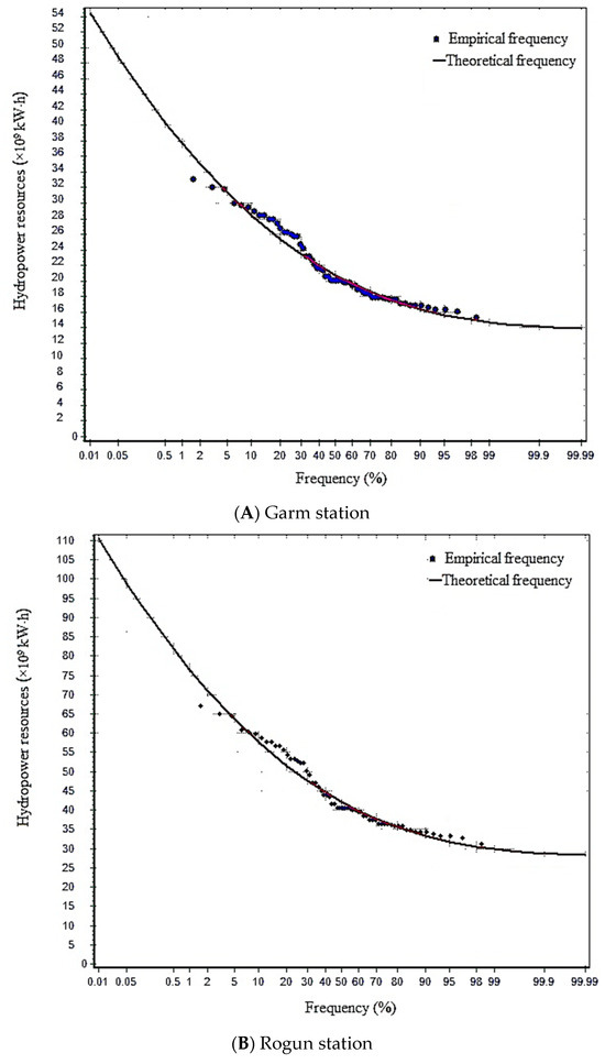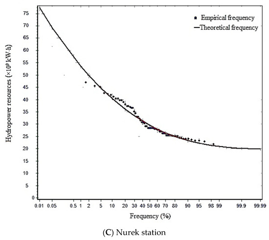 Since annual runoff is highly variable and uncertain, it poses challenges for water energy development. To reduce risks and optimize economic investment, understanding the frequency distribution of hydropower resources is critical. A Pearson Type III distribution analysis was conducted on the hydropower resources of the three representative sections (Garm, Rogun and Nurek), with the results shown below.