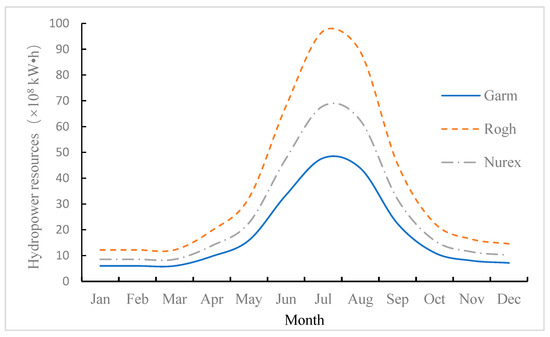 Table 2 shows that the hydropower resources of all three sections exceed 50 billion kWh/year, with the ranking Rogun > Nurek > Garm. The data indicate that the distribution of hydropower resources among different sections is not solely governed by upstream-downstream relationships. Although downstream sections (e.g., Garm) exhibit higher annual runoff, a notable elevation difference in specific areas can exert a more pronounced impact on the outcomes.