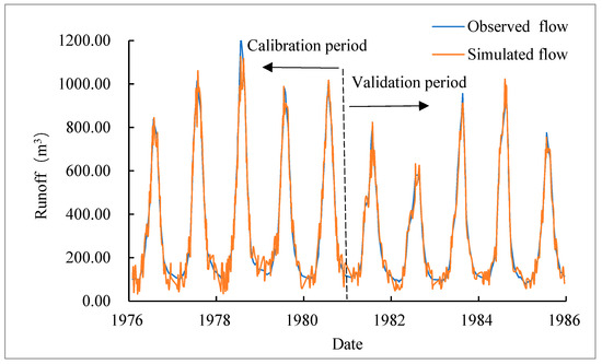 In the Vakhsh River Basin, glacier and snow melt driven by climate change significantly impacts river runoff. Therefore, this study introduces a snowmelt runoff model (SRM) to simulate runoff variations. Based on existing data, the 1976–1980 data from Garm Hydrological Station were used for model calibration, and the 1981–1985 data were used for model validation. The results are shown in Figure 5.