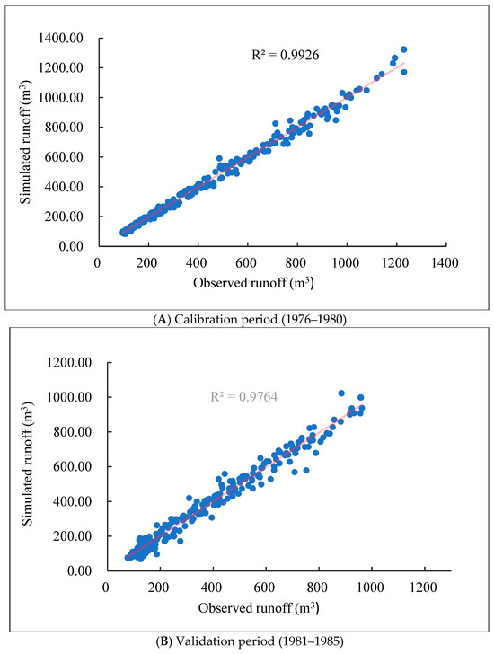 Figure 6 shows excellent consistency between observed and simulated runoff during calibration and validation periods. To further quantitatively analyze its accuracy, the simulation accuracy metrics (Coefficient of Determination R2 and Nash–Sutcliffe Efficiency Coefficient NSE) were calculated. The results are presented in Figure 7.