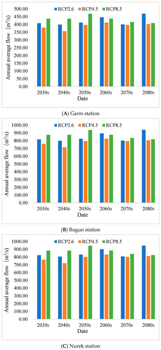 Figure 8 shows that runoff increases to varying degrees with rising precipitation and temperature. Over the next 50 years, with a 95% confidence level, the total flow rates for the Garm, Rogun, and Nurex sections are 415.64 ± 57.77, 832.78 ± 114.52, and 839.30 ± 168.09 m3/s, respectively. The flow increase follows the order RCP4.5 < RCP2.6 < RCP8.5, which differs from the precipitation trend. This inconsistency occurs because the basin relies heavily on snowmelt runoff, where temperature rise also plays a significant role. At the Garm, Rogun, and Nurex sections, with a 95% confidence level, flow increases by 93.72 ± 13.04, 187.78 ± 25.84, and 189.25 ± 37.91 m3/s, respectively, with all three seeing a nearly 30% increase.