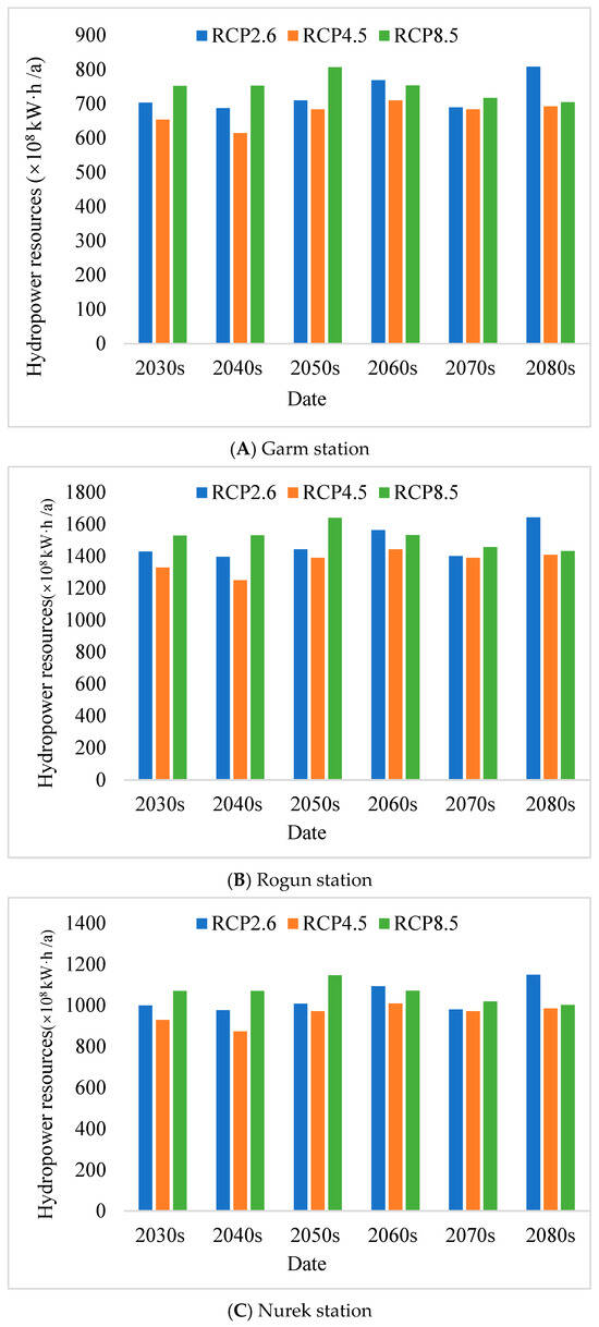 Figure 9 shows that under the three scenarios (RCP2.6, RCP4.5, and RCP8.5), hydropower resources increase with rising runoff, with increments ranging from 162 ± 22.54 to 328,108 ± 45,652.24 kWh/a with a 95% confidence level. In terms of growth magnitude, the order is: RCP4.5 < RCP2.6 < RCP8.5. From a spatial perspective, Garm exhibits the smallest increase, while Nurex shows the largest growth, followed by Rogun. The trend of change aligns with runoff variations.