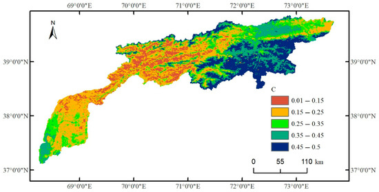 Spatial distribution of the C factor in the Vakhsh river basin.
