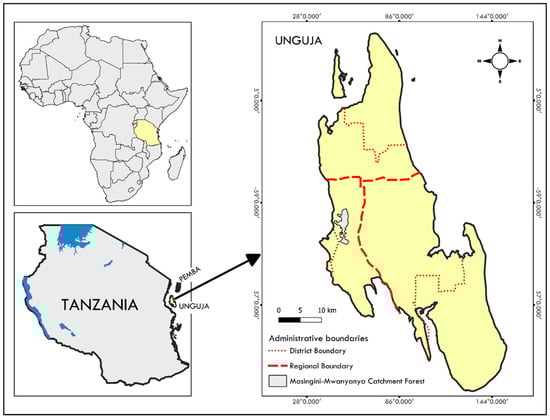 The study area of Unguja Island in Zanzibar (Tanzania) and the Masingini–Mwanyanya forest catchment near Zanzibar City.