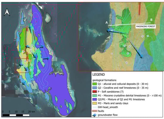 Hydrogeological map of Unguja Island (Zanzibar), modified from Colbert et al. (1987) []. The cross-section AB is represented in Figure 3.