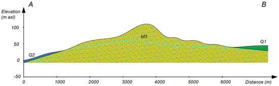 Hydrogeological cross-section AB (see Figure 2). Groundwater (GW) level in light blue is taken from Colbert et al. (1987) [].