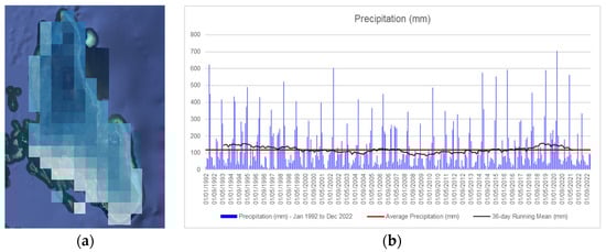 (a) Spatial grid resolution and (b) total monthly precipitation pattern of Unguja Island. Data source: TerraClimate from Climate Engine tool (website: http://climateengine.org; last access: 20 October 2025) [,,].