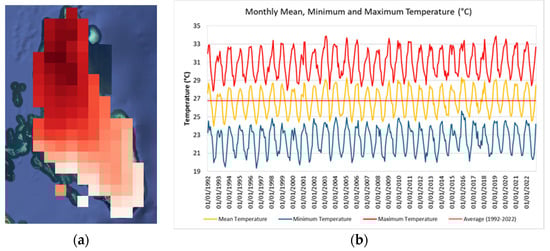 (a) Spatial grid resolution and (b) mean monthly temperature pattern of Unguja Island. Data source: TerraClimate from Climate Engine tool (website: http://climateengine.org; last access: 20 October 2025) [,,].