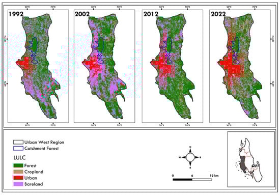 Land use and land cover evolution map in the Urban West Region and Masingini–Mwanyanya catchment forest (Landsat images—see Table 1).