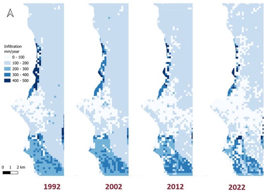 In the coastal area of Zanzibar City, urban expansion has progressively encroached upon inner zones, replacing green and natural areas between 1992 and 2022. Over the same period, the annual infiltration rates calculated with the hydrogeological water balance have decreased accordingly, as shown in Figure 12.