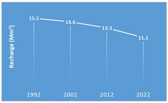 Specifically, infiltration volumes declined from 15.5 Mm3 (millions of cubic meters) in 1992 to 11.1 Mm3 in 2022 (Figure 13), resulting in a net loss of approximately 4.4 Mm3, equivalent to a 28% reduction in the total aquifer recharge. This decline could worsen the problem of seawater intrusion, which had already been triggered by increased groundwater pumping [,,].