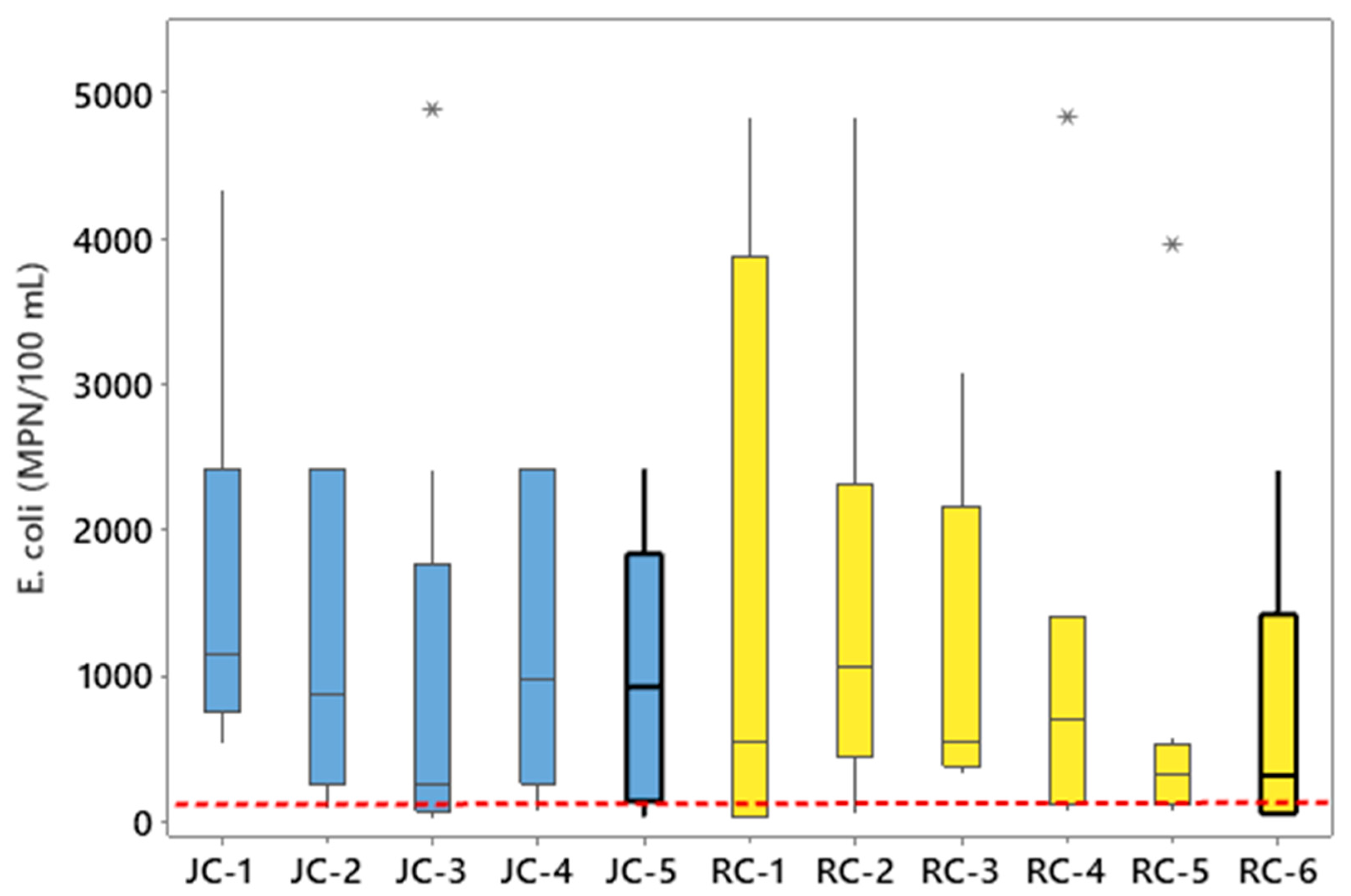 - US EPA Recreational Water Quality Criteria. EPA-820-F-12-061. Available online: https://www.epa.gov/sites/default/files/2015-10/documents/rec-factsheet-2012.pdf (accessed on 28 May 2025).