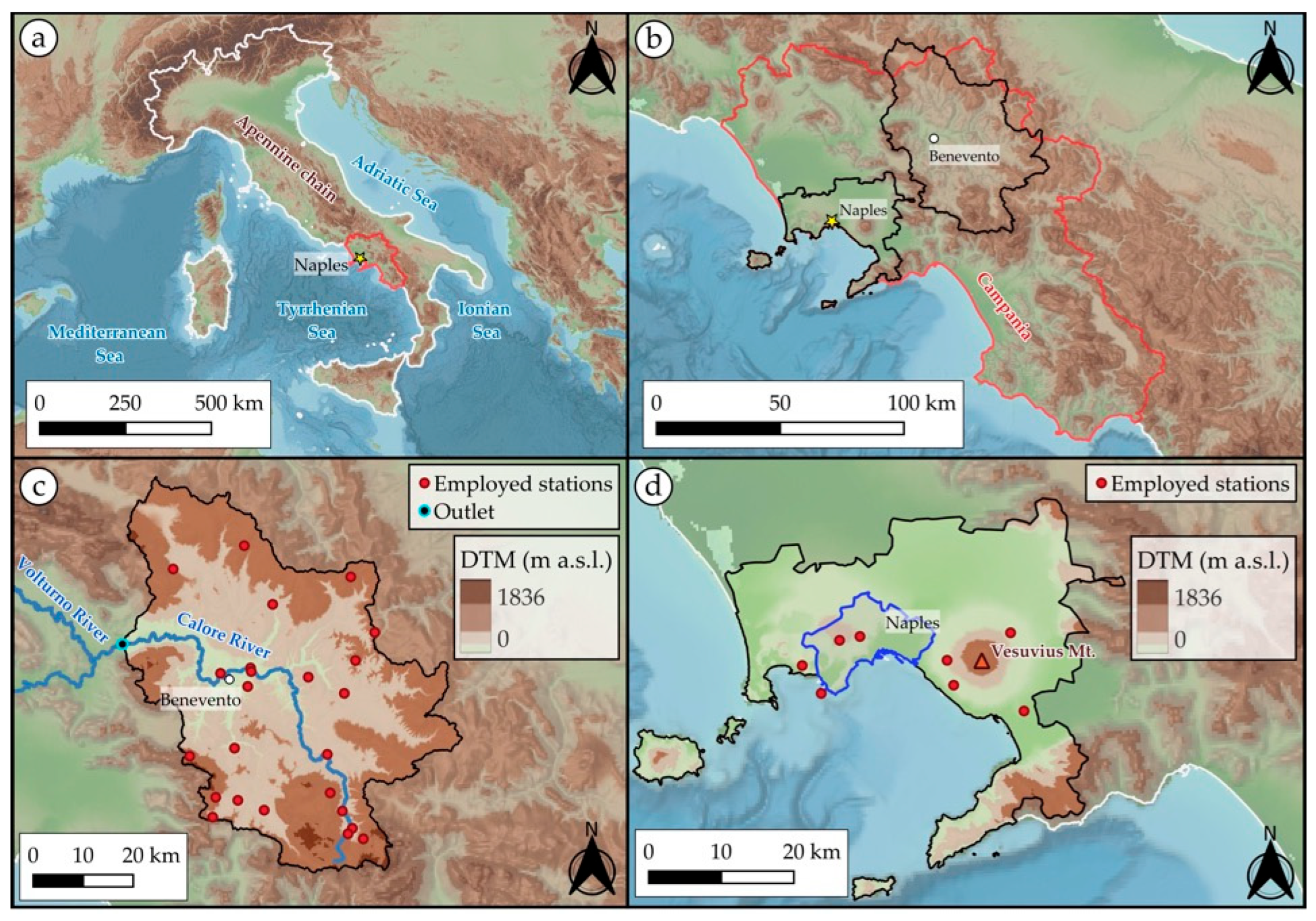 Within this larger area, the present study focused on two specific target areas (Figure 1c,d) that exemplify the region’s geographical and environmental diversity: the Calore Irpino River basin (hereafter Calore River basin for the sake of simplicity), located in the inland eastern part of Campania, and the Metropolitan City of Naples, situated along the coast.