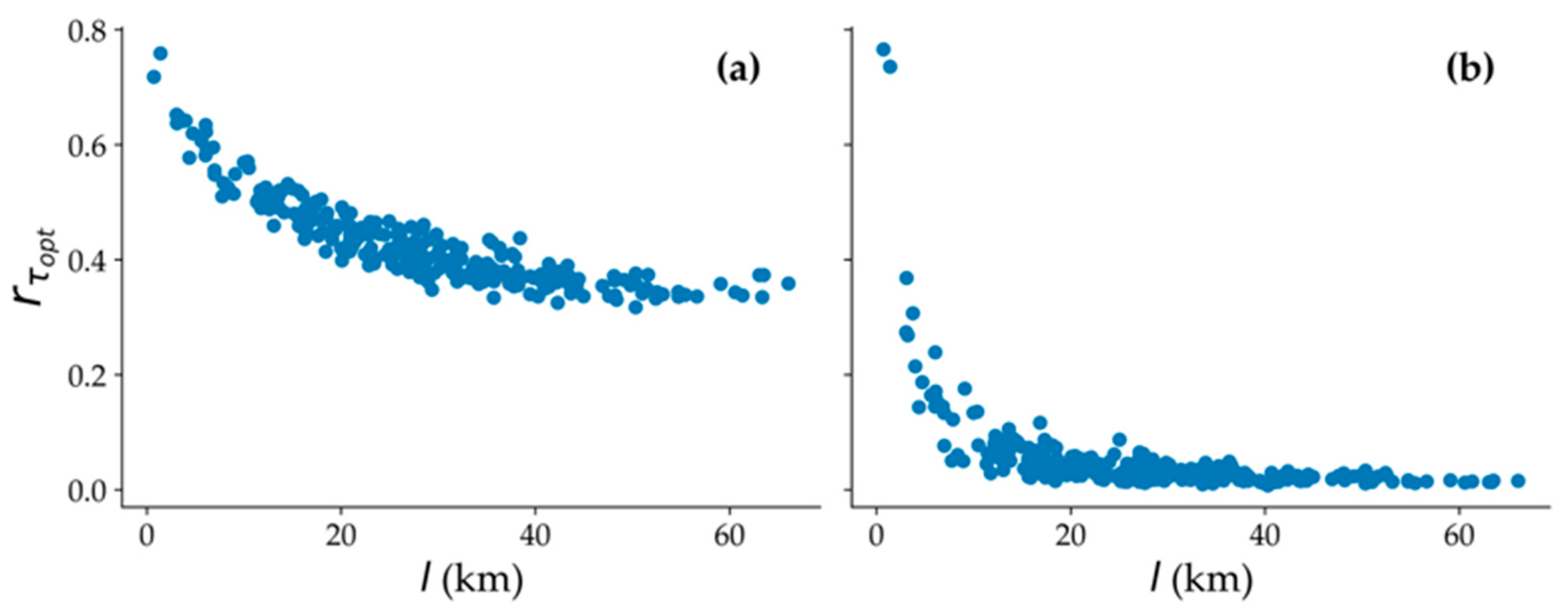 In Figure 3a, the value r τ o p t of the PCC corresponding to τopt is plotted against the distance l between stations. The inspection of the figure shows that r τ o p t decreases with l and becomes statistically insignificant beyond a certain distance, which is not clearly defined. For this reason, the PCCs were recalculated using new time series consisting of the difference in rainfall depth between two consecutive time intervals. These new time series are intended as a proxy of the rainfall intensity derivative, which is positive when the rainfall intensifies and negative when it decreases. When these differential time series are used, the PCC clearly drops to zero beyond l = 25 km (Figure 3b). Based on this result and the shape of Figure 3a, distance and correlation coefficient thresholds were set at 25 km and 0.4, respectively.