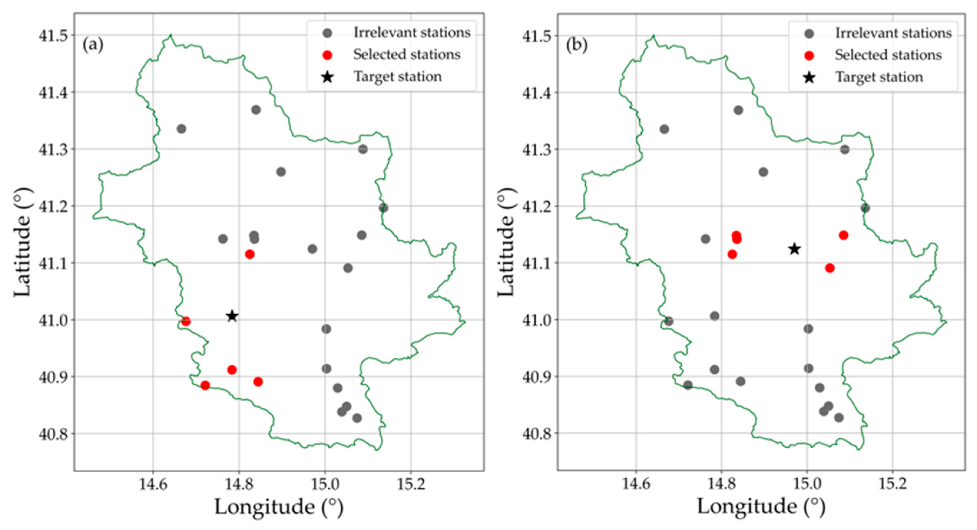 Station clusters were finally formed by applying the above-defined thresholds on the correlation coefficient and spatial distance, ensuring that stations within the same cluster exhibited strong correlation while maintaining geographic proximity. For the Calore River basin, this resulted in five rain gauge clusters. The sensor clusters for Rocchetta and Altavilla Irpina stations are presented in Figure 4 as an example.