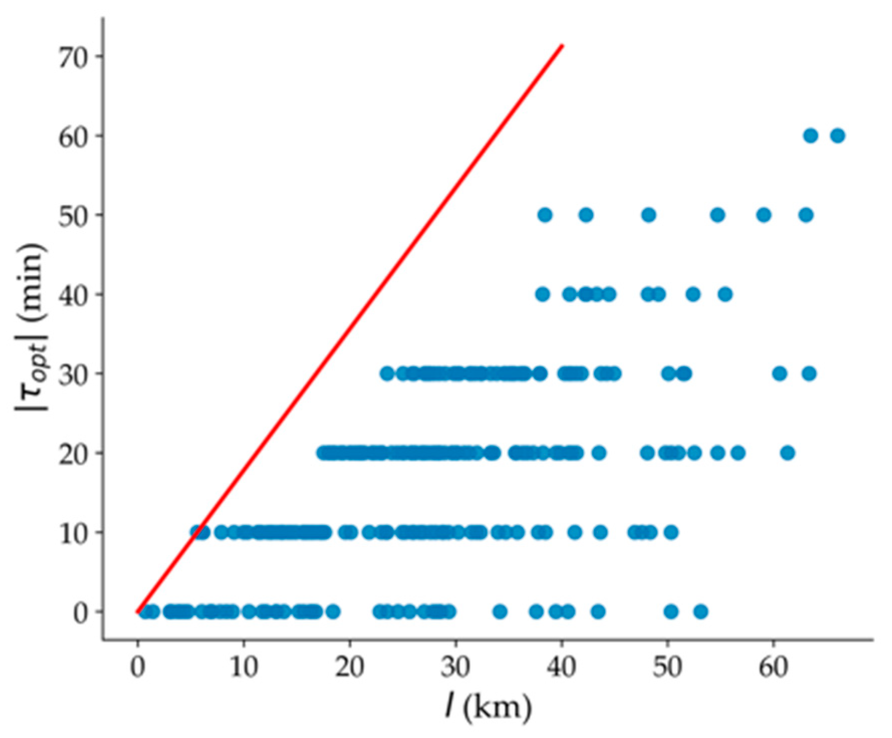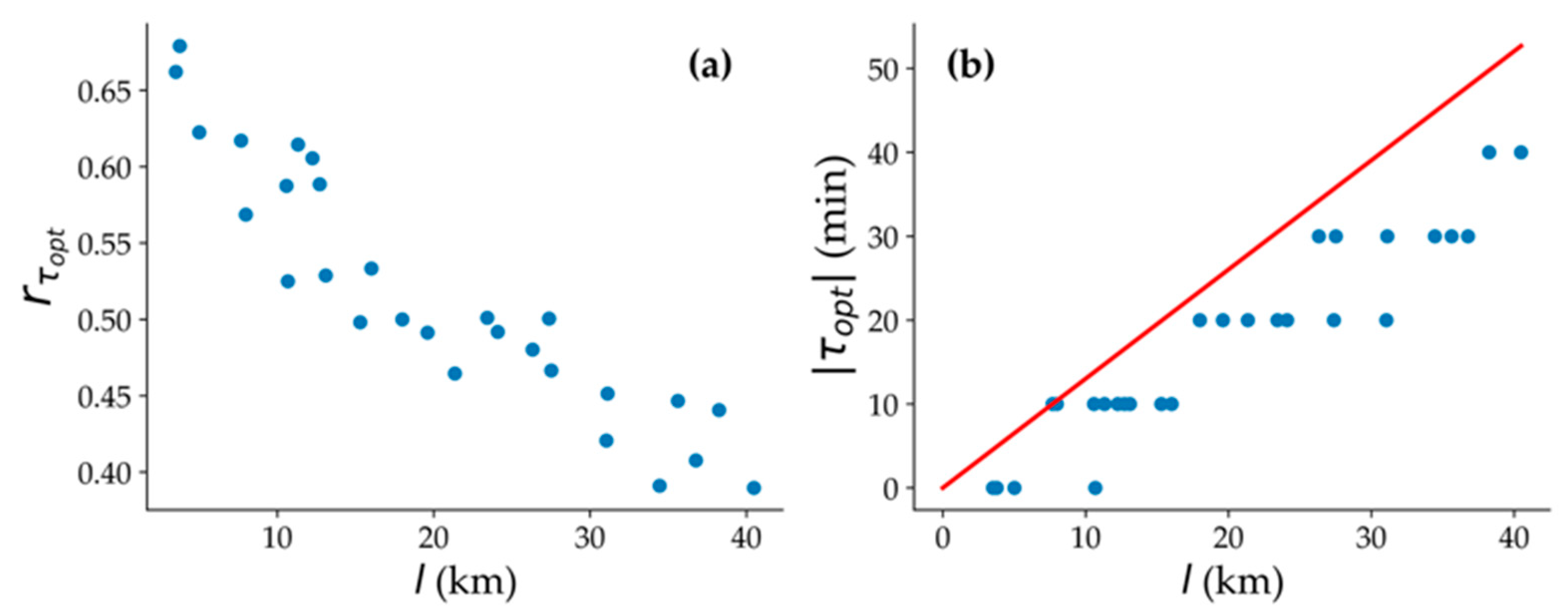 In Figure 6a, the values of r τ o p t are reported as a function of the distance l for the Metropolitan City of Naples, again showing that the correlation between two stations decreases with the distance. However, the clustering operation was not carried out for this area due to the small number of sensors. In Figure 6b, the absolute value of τopt is plotted as a function of l, demonstrating also in this case that information transfer between stations is carried with a minimum celerity equal to 12.8 m/s (slope of the envelope red line in Figure 6b).