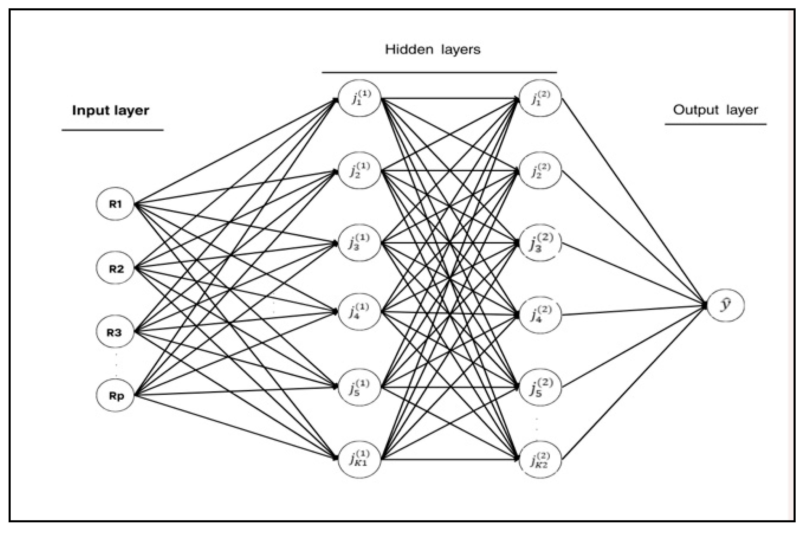 where the meaning of the symbols is as follows: p is the number of input features Ri, K is the number of hidden units (neurons) in the hidden layer, w j i ( 1 ) is the weight from input Ri to the hidden unit j, and b j ( 1 ) is the bias term associated with the hidden unit j. The activation function σ . , can be any non-linear function such as the sigmoid, hyperbolic tangent (tanh), or ReLU (rectified linear unit). After the hidden layer, each hidden unit j connects to the output through a weight w j ( 2 ) , and a final bias term at the output is represented as b ( 2 ) . The predicted output, which in this case represents the estimated rainfall, is denoted by y ^ . Figure 8 represents the multilayer perceptron model with two hidden layers used in the present application.