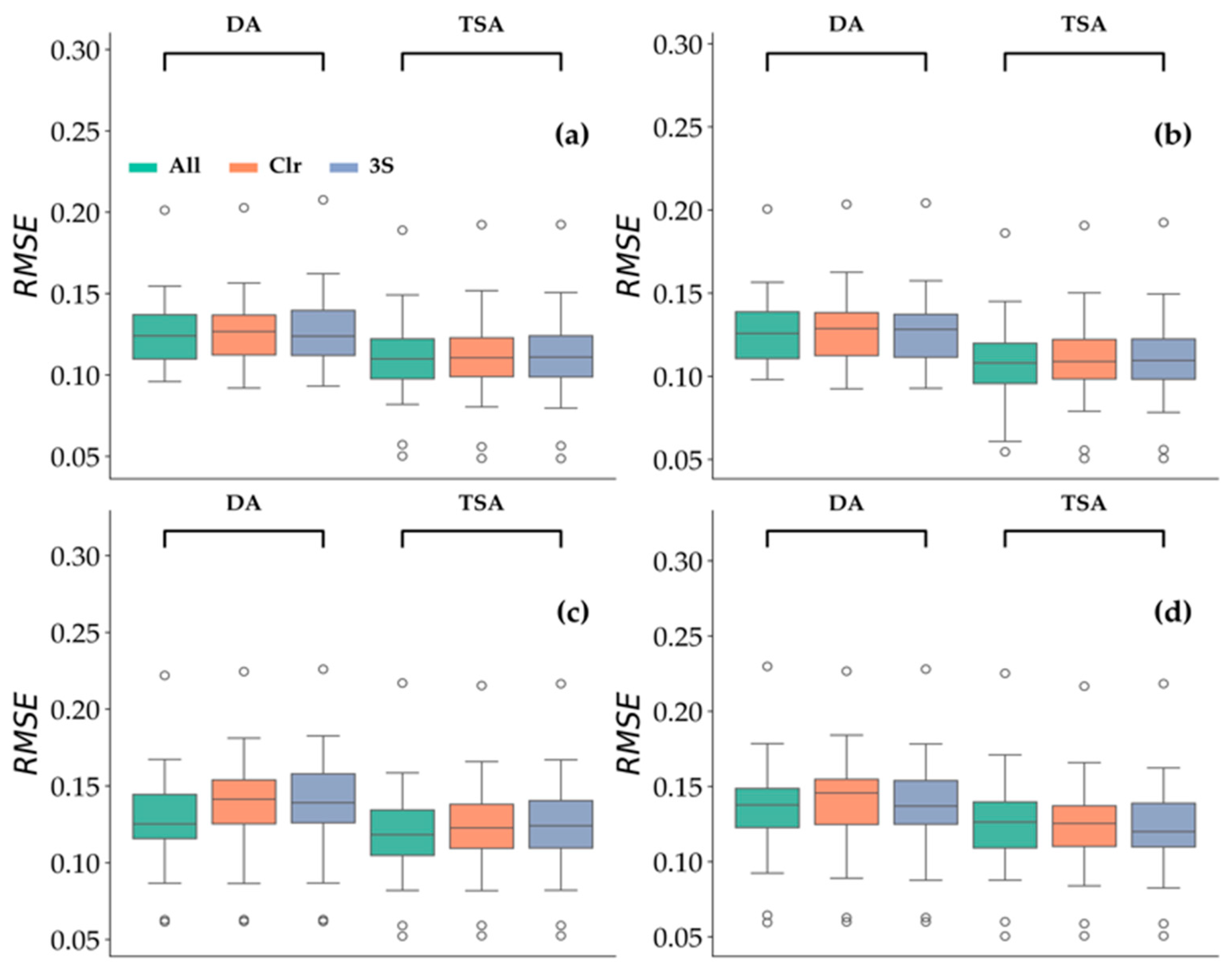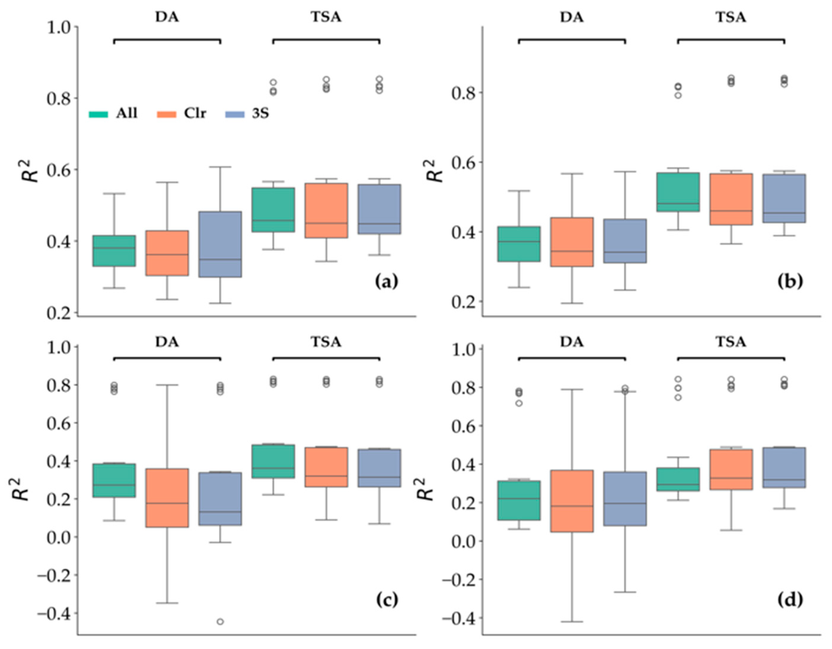 In contrast, DA applied the regression models to the full dataset without any prior classification (Figure 7b). All the observations, regardless of the precipitation status, were treated as continuous values and directly imputed.