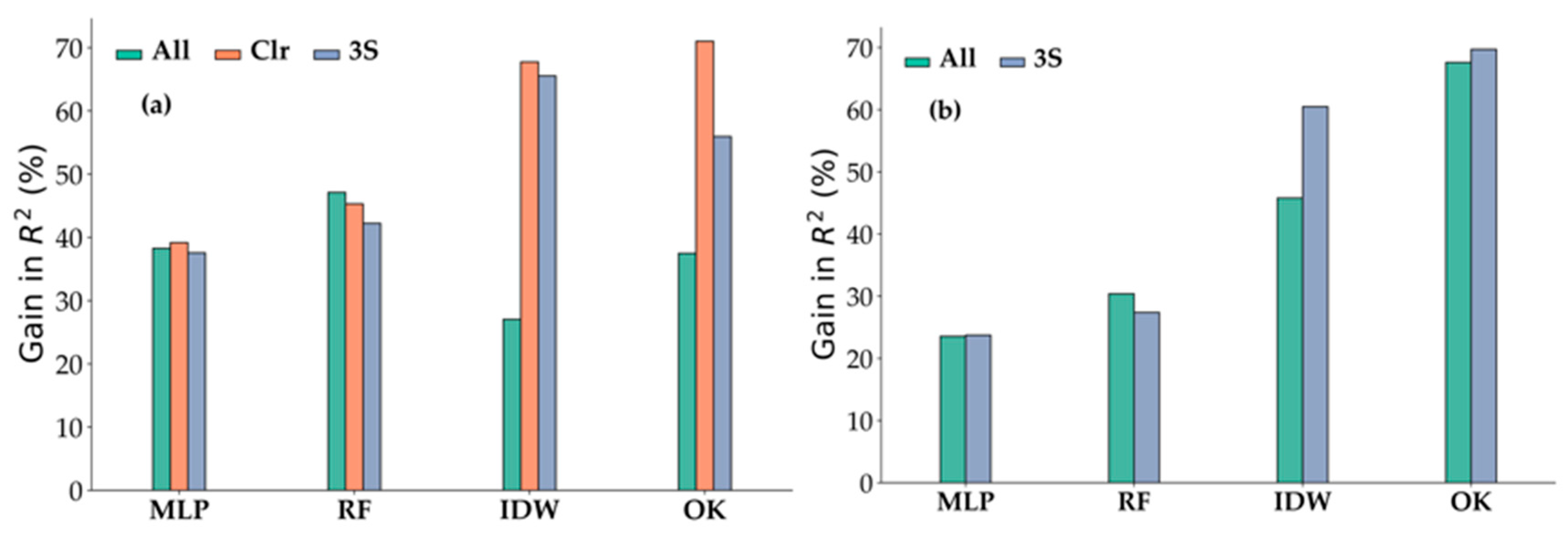 Following this idea, an RF binary classifier was trained to distinguish between rain (1) and no-rain (0) time intervals during the first stage of TSA (Figure 7a). In the subsequent stage, which employed one of four regression methods, including MLP, RF, OK, and IDW, only intervals classified as rainy were subjected to regression-based imputation, while no-rain time steps were assigned a value of zero without further modeling (Figure 7a).