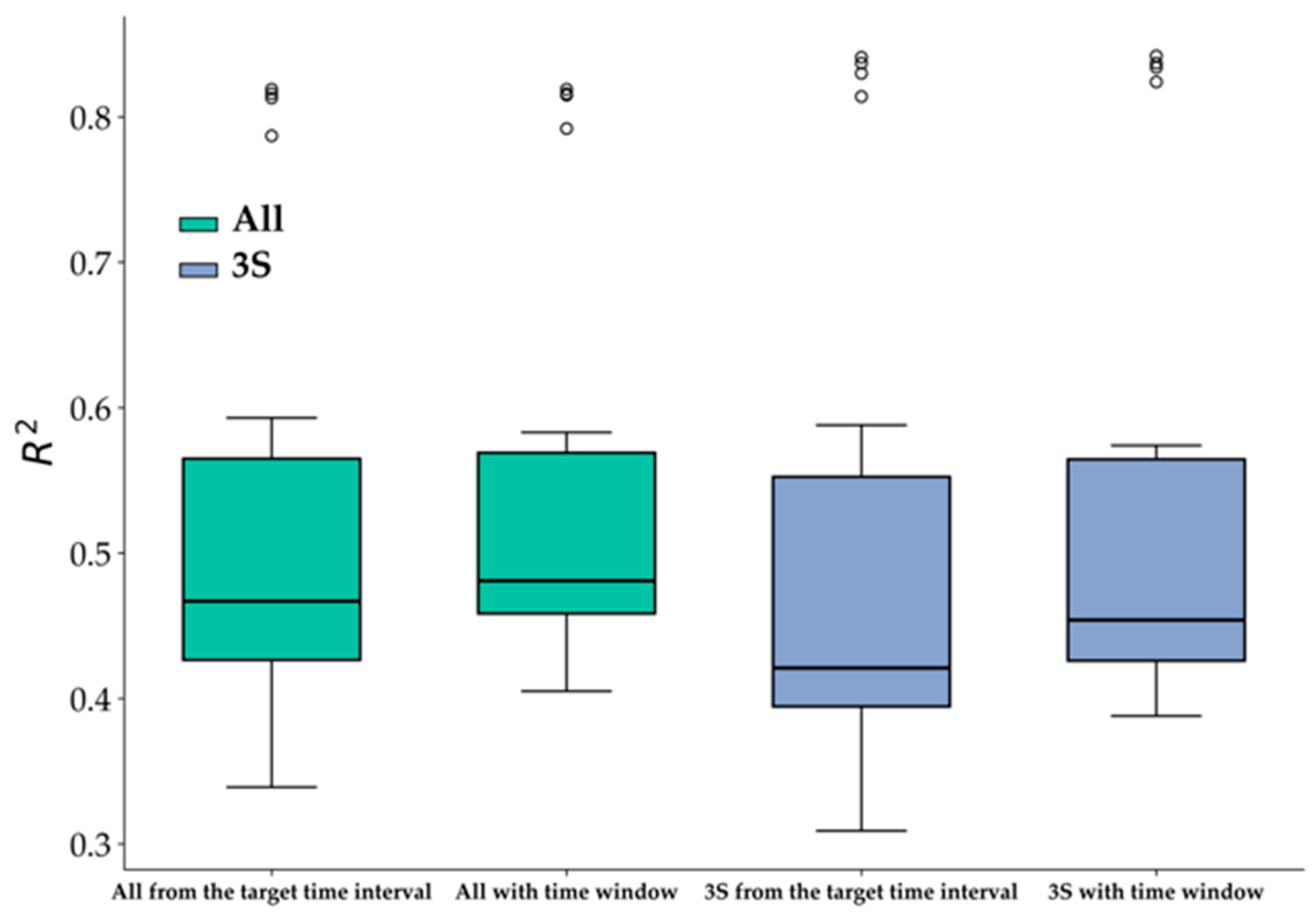 Preliminary data preprocessing of Section 2.2 shows that the precipitative signals travel between stations with finite celerity. This suggests that information at preceding or subsequent time intervals in surrounding stations could be relevant for imputing missing data at the targeted station during the targeted time interval. To capture the local temporal context, a sliding time window of 21 steps centered on the targeted time interval was incorporated into the analysis. This window was designed to provide a comprehensive temporal frame that could enhance the predictive capacity of the models across both imputation strategies.