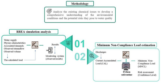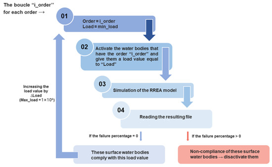 As a second part of the methodology, a Python program was developed to determine the minimum load value that causes the non-compliance of each SWB. The process of our program, presented in Figure 3, starts from the SWBs with order 0 (i.e., the headwater SWBs), activating them and giving them a minimum load value equal to 0.1 g/month. Then, the RREA model was automatically simulated, obtaining the failure (non-compliance) results, which were imported to check if failures occurred with this load. The load values were increased within the loop till all the activated SWBs became non-compliant (the maximum load value is 1,000,000 g/month). Then, the loop moved to the SWBs with order 1, and the same process was repeated until all the orders were completed.