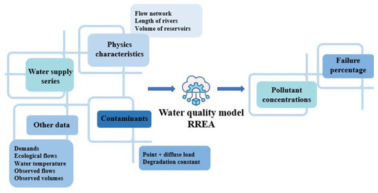 Diagram of the large-scale water quality model RREA. The blue arrows represent the input variables and results of the RREA model.