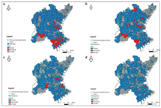On the other hand, lead (Pb), which is a silvery-grey metal with high corrosion resistance and malleability, is widely utilized in industry. Lead is commonly found in the surface layers of soil and water, and its use in ammunition and fishing tackle contributes to its long-term persistence in the environment. The examination of lead concentrations, with an AM of 1.2 µg/L and a MAC of 14 µg/L, indicates non-compliance in various SWBs within the Júcar RBD (Figure 6b).