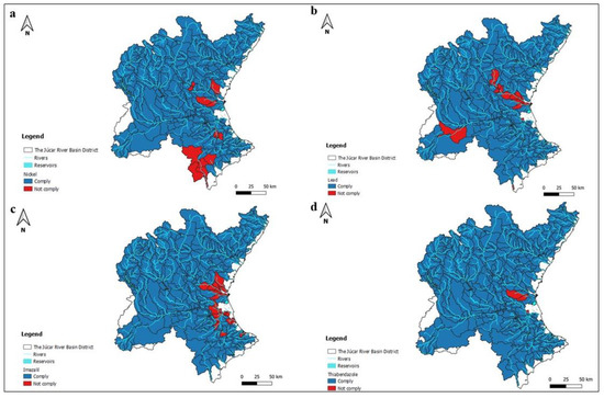 Water bodies (sub-basins) that comply and do not comply based on the monitoring observations: (a) nickel, (b) lead, (c) imazalil, and (d) thiabendazole.