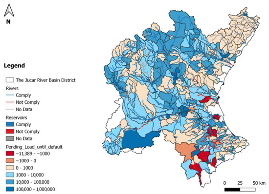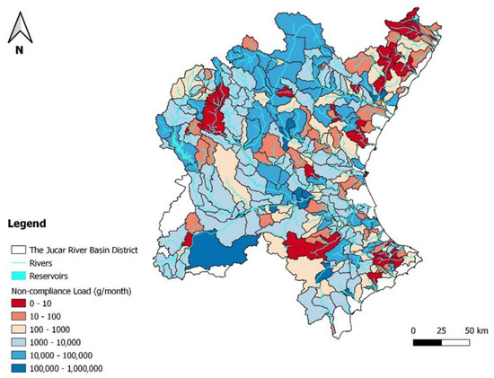 The comparison of the modelling results with the accumulated load that is currently present in the Júcar RBD (Figure 10) reveals that there is a noticeable correlation between the two data sets, indicating that the trends and patterns found are rather consistent. According to this correlation, the approach proposed in this paper is capable of capturing important factors and processes that are relevant to evaluating nickel loads in the Júcar RBD. Focusing on the part of the Júcar River Basin, almost the entire SWBs of this zone present a good nickel status with accumulated load values between 100 and 1000 g/month. These results are fully consistent with our analysis, which shows that the minimum load non-compliance values for these SWBs range between 100 and 1,000,000.
