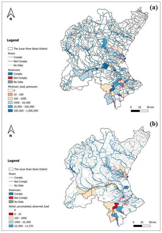 Comparison between the minimum load of non-compliance (a) and the accumulated observed load values (b) of the surface water bodies under pressures in the Júcar River Basin District regarding nickel concentration.