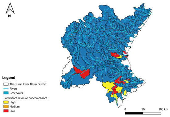 Estimation of the different confidence levels of compliance and non-compliance of the surface water bodies in the Júcar River Basin District. The observation data come from measurements taken by the monitoring network of the Júcar River Basin Agency (Section 3.2).