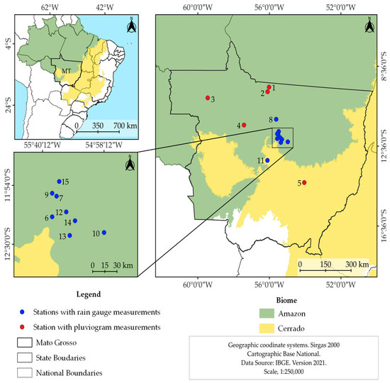 Location map of the fifteen stations located in the Amazon Basin, Mato Grosso state, Brazil. (Data source: IBGE [44]). Numerical identification according to Table 1.