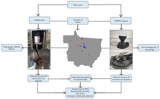 Flowchart of the methodology used to collect, organize, and measure data and classify natural rainfall intensity patterns. The blue dots indicate the stations with rain gauge measurements from the Water Resources Technology in the Midwest research group at UFMT, while the red dots indicate the stations with pluviogram measurements from the National Hydrometeorological Network (CPRM/ANA).