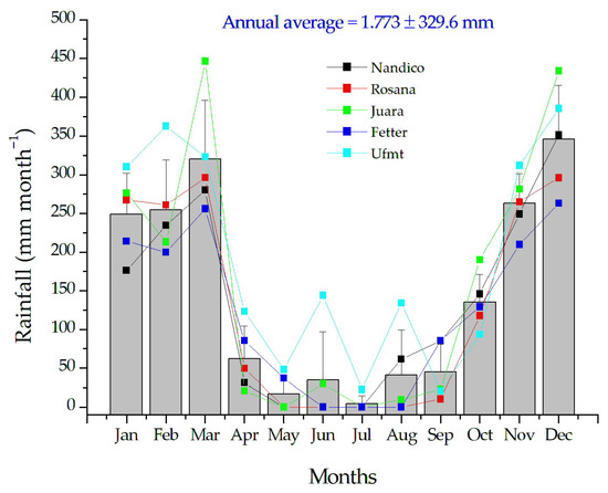 The 15 meteorological stations studied, located in the northern mesoregion of Mato Grosso, showed similar patterns in annual rainfall, despite differences in data collection intervals. The regional climate exhibited a dry season from May to September and a rainy season from December to March (Figure 3), with the highest average monthly rainfall in March (320.4 mm month−1) and December (360.4 mm month−1). The recorded average annual rainfall was 1786.9 mm, confirming the high rainfall characteristic of the northern part of Mato Grosso.