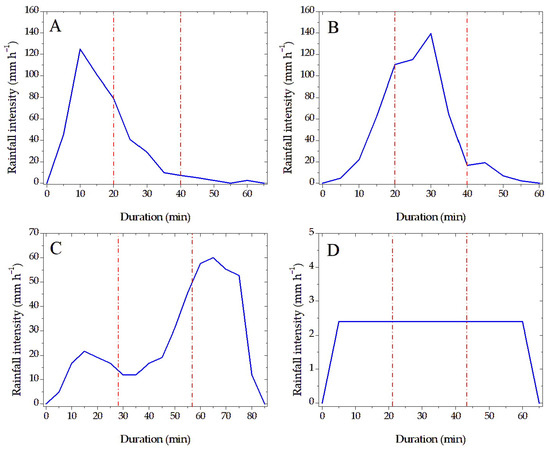 The classification of natural rainfall intensity patterns was based on the distribution of peak rainfall throughout the duration of the events (Figure 4). The analyzed hyetograms showed that events with similar intensities and depths can exhibit different temporal distribution patterns, even when they have the same durations. In Figure 4A, the advanced pattern was depicted by an event with a peak of 120 mm h−1 in the first 10 min. The intermediate pattern (Figure 4B) and the delayed pattern (Figure 4C) displayed maximum peaks of 130 mm h−1 and 60 mm h−1, occurring after 33% and 66% of the duration, at 30 and 55 min, respectively. The Constant pattern (Figure 4D) illustrates a nearly uniform intensity throughout the event.