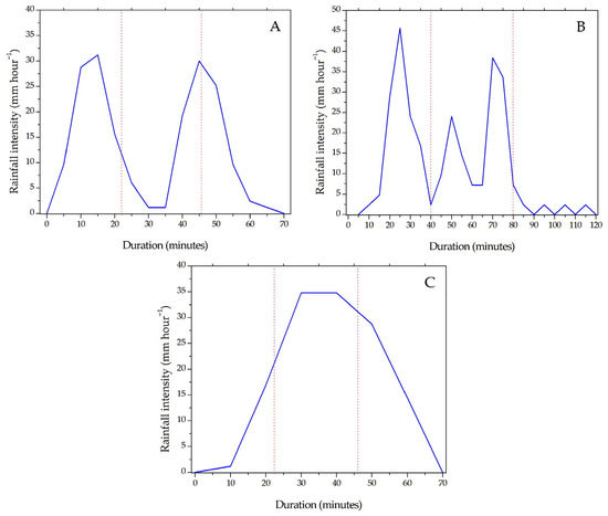 The “M” pattern shows two similar intensity peaks with a decrease in intensity at the mean rainfall time (Figure 6A). In the case of the “W” pattern (Figure 6B), the data indicate three intensity peaks at 25, 50, and 70 min, with values of 45, 25 and 35 mm h−1, respectively. These events differ from more traditional intensity distribution patterns, as the moments of greatest precipitation are not focused in a single point of the event [63,64,65], reflecting a more complex and fragmented rainfall distribution over time and with different impacts on the infiltration and runoff components of the soil, especially on erosion processes.