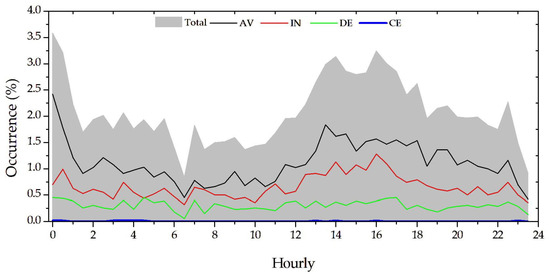 Furthermore, the hourly distribution of rainfall events across the four patterns analyzed was examined (Figure 7). The AV pattern showed more events between 12.5 and 18.0 h (33.59%) and from 0.0 to 6.0 h (28.18%), indicating afternoon and nighttime activity, with higher percentages occurring between 13.0 and 13.5 h (114 events, representing 1.8426% of all evaluated events). For the IN pattern, events mainly clustered between 12.5 and 17.5 h (616 events or 9.96%), with the highest percentage at 1.2769% (79 rains). The DE pattern displayed a more evenly distributed frequency of occurrences throughout the day.