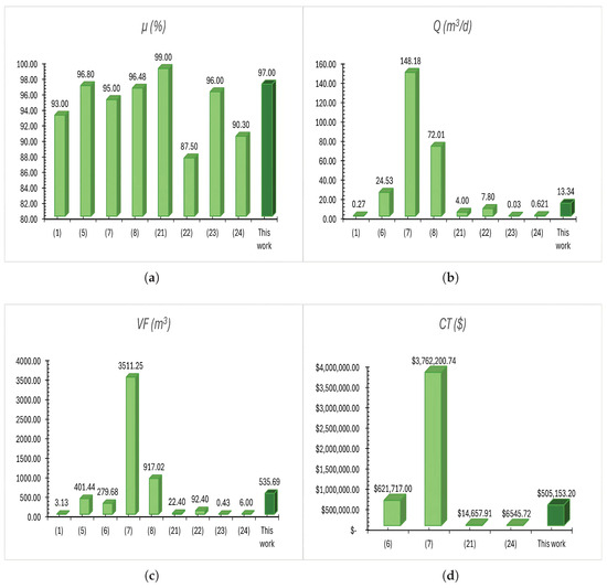 Comparison of this work with previous studies: (a) removal efficiency (), (b) treated flow rate (Q), (c) physical volume () and (d) total cost ().