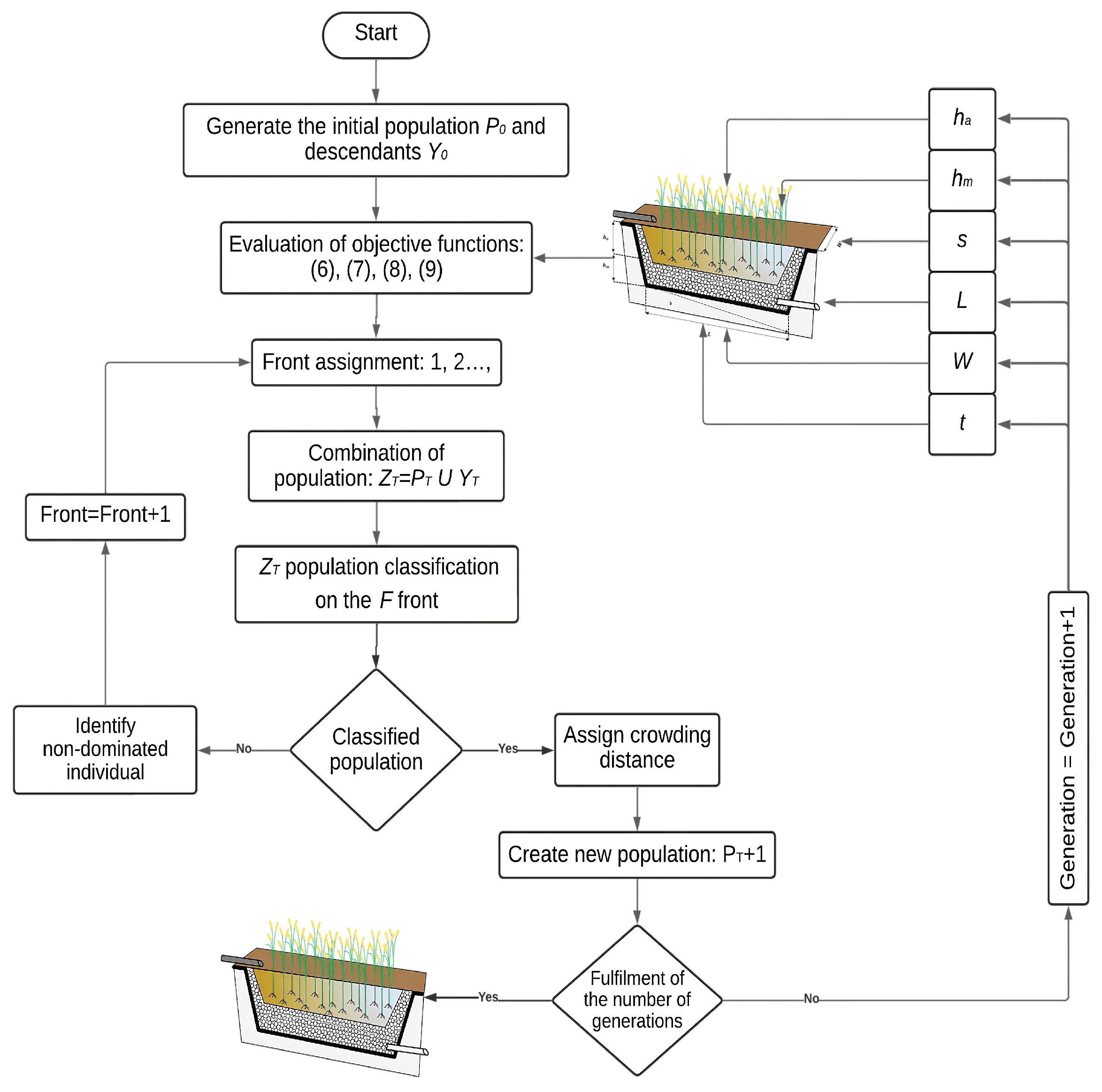 Research focused on optimization-based design has incorporated multiple mathematical and decision-support tools. Among the most representative approaches are empirical models, such as the one proposed by Reed and reported by Andreo et al. [3]; non-stationary reinforcement learning methods integrated into decision-support systems, such as WRESTORE, described by Hoblitzell et al. [4]; hydrodynamic modeling using the MIKE 21 software, employed by Liao et al. [5]; and neural networks optimized through the ADAM algorithm, implemented by Pengyu et al. [6]. Within this framework, multi-objective optimization algorithms, particularly NSGA-II, have gained increasing importance due to their ability to simultaneously manage conflicting design criteria. More recently Mendez et al. [7] carried out the evolutionary optimization of an HFSW for graywater treatment using the NSGA-II evolutionary algorithm. Two objectives were established: minimize the physical volume of the HFSW and maximize the contaminant removal efficiency. These objectives are defined based on six performance variables: hydraulic retention time, length, width, water depth, media depth, and slope. The set of solutions is obtained to generate the Pareto front. However, they do not consider either the flow rate or the construction costs of the HFSW as optimization objectives. This fact translates into high costs and a minimum flow of water to be treated. Likewise, the search space for its solutions is restricted to a small volume, limiting the exploration of new search spaces.