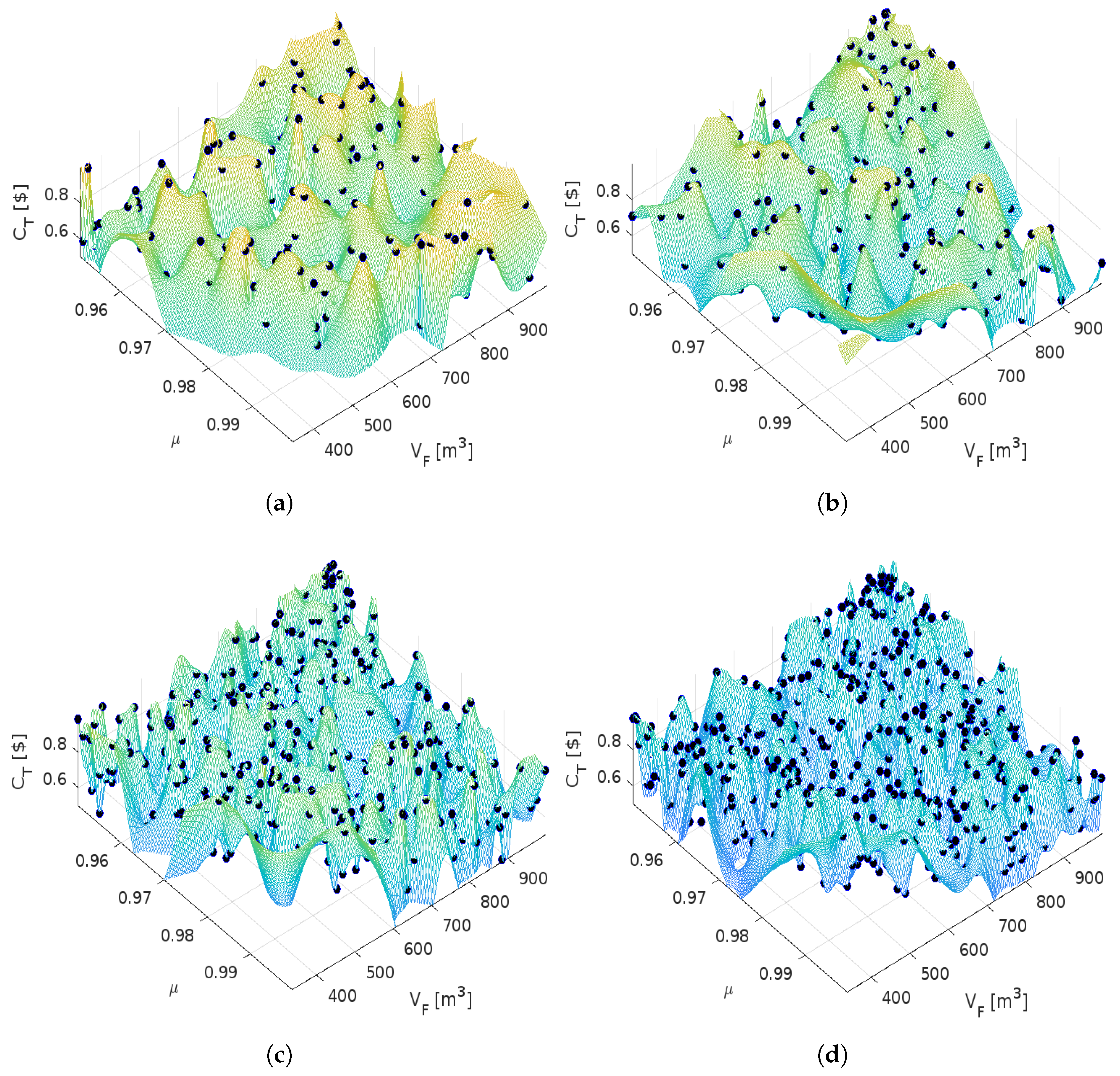 Pareto surface of vs. vs. (axis normalized to millons) for (a) P = 80 and G = 100, (b) P = 200 and G = 400, (c) P = 500 and G = 700, and (d) P = 700 and G = 1000.