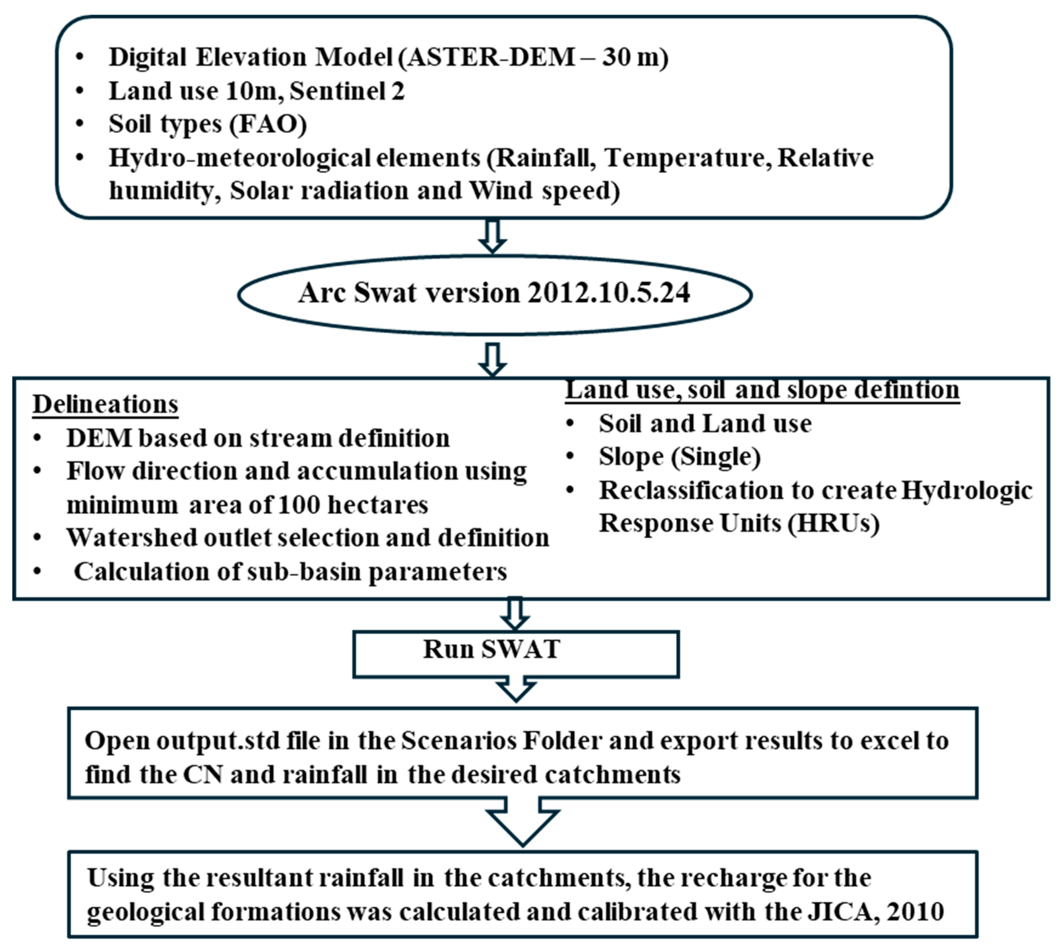 - Using a soil and water assessment tool (SWAT) model for recharge estimation, which depends upon many parameters, for instance hydro-meteorological data, land uses and covers, digital elevation models (DEMs), soils, groundwater levels, watershed delineations, calibration and validations of the results, and spatial and temporal simulation of groundwater recharge. The parameters for input and output related to the groundwater recharge evaluation utilizing the SWAT model are illustrated in Figure 4.